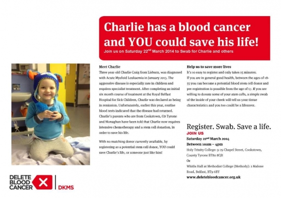 Three year old Charlie from Lisburn is the son of Thompsons’ Finance Director Fintan Craig. Charlie was diagnosed with Acute Myeloid Leukaemia in January 2013, and over the 14 months that would follow, Charlie and his family would embark on a roller-coaster journey. Now in March 2014 Charlie requires intensive chemotherapy and a stem cell donation in order to save his life.