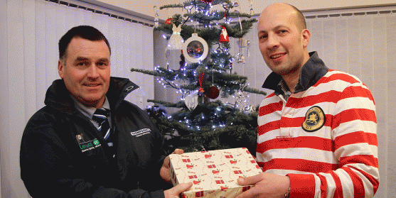 ‘A Festive First….James Mark McClements was picked as the lucky winner of Thompsons’ first facebook competition. Thompsons’ James Gabbey (left) gets to be Santa as he delivers some Christmas goodies including a £100 voucher for PC World to James Mark at his Portavogie farm. With the draw held at last week’s Winter Dairy Fair in the Kings Hall, 25